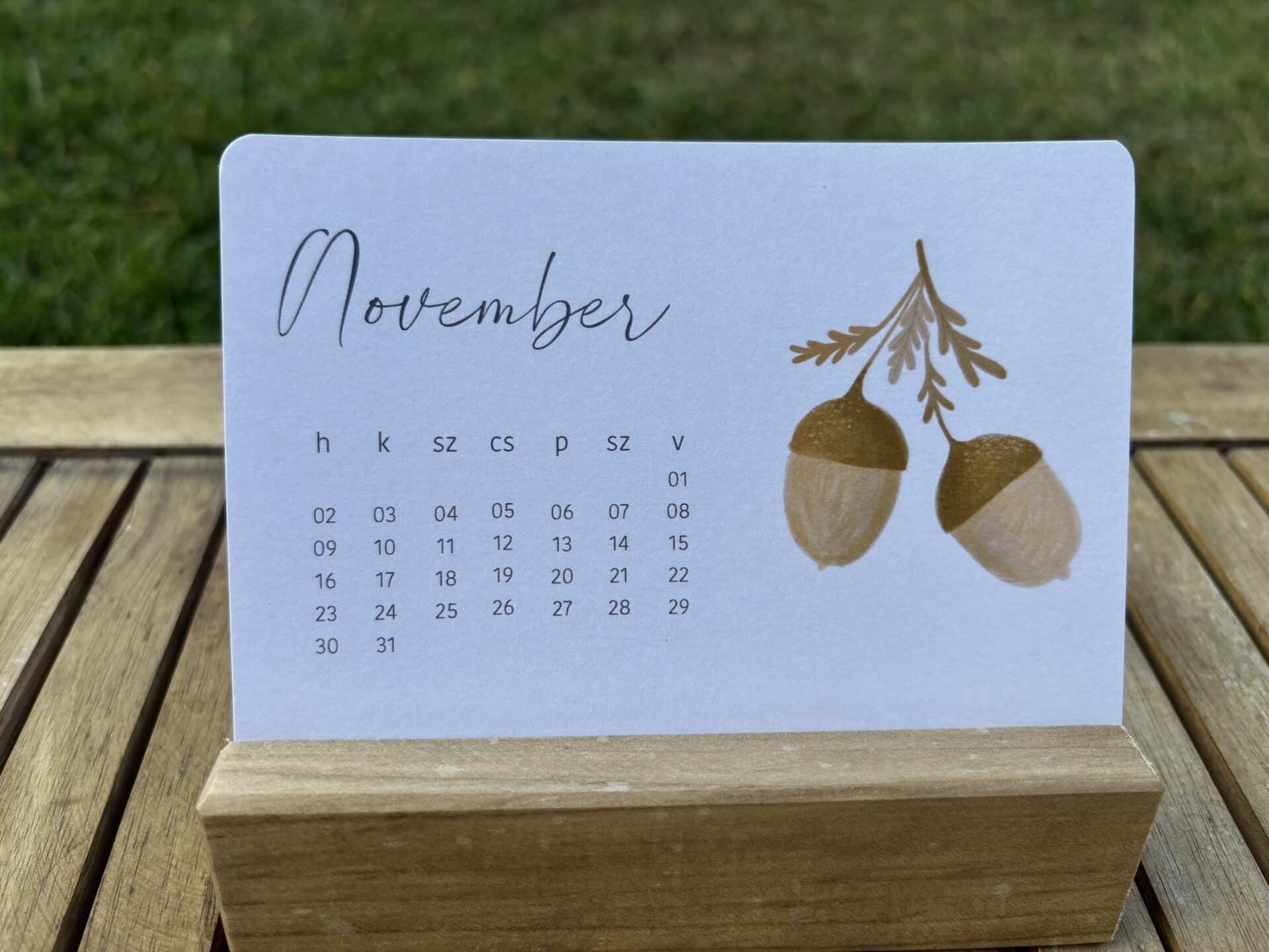 Méretének köszönhetően nem foglal sok helyet az asztalodon, viszont dekorálja azt. A naptár mellé egy fa tartó is jár.