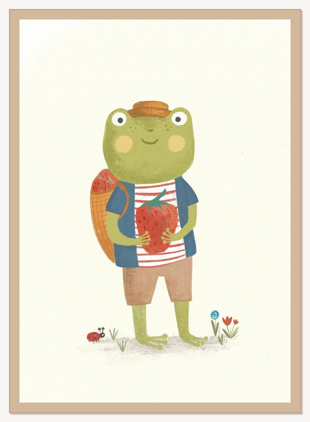Ez a vidám kis béka épp eperszüretről tért haza! 🐸🍓 Hátizsákja tele, kezében egy szem óriás eper — és a mosolya mindent elárul. Kézzel rajzolt illusztráció, ami jókedvet és nyári hangulatot hoz a gyerekszobába.