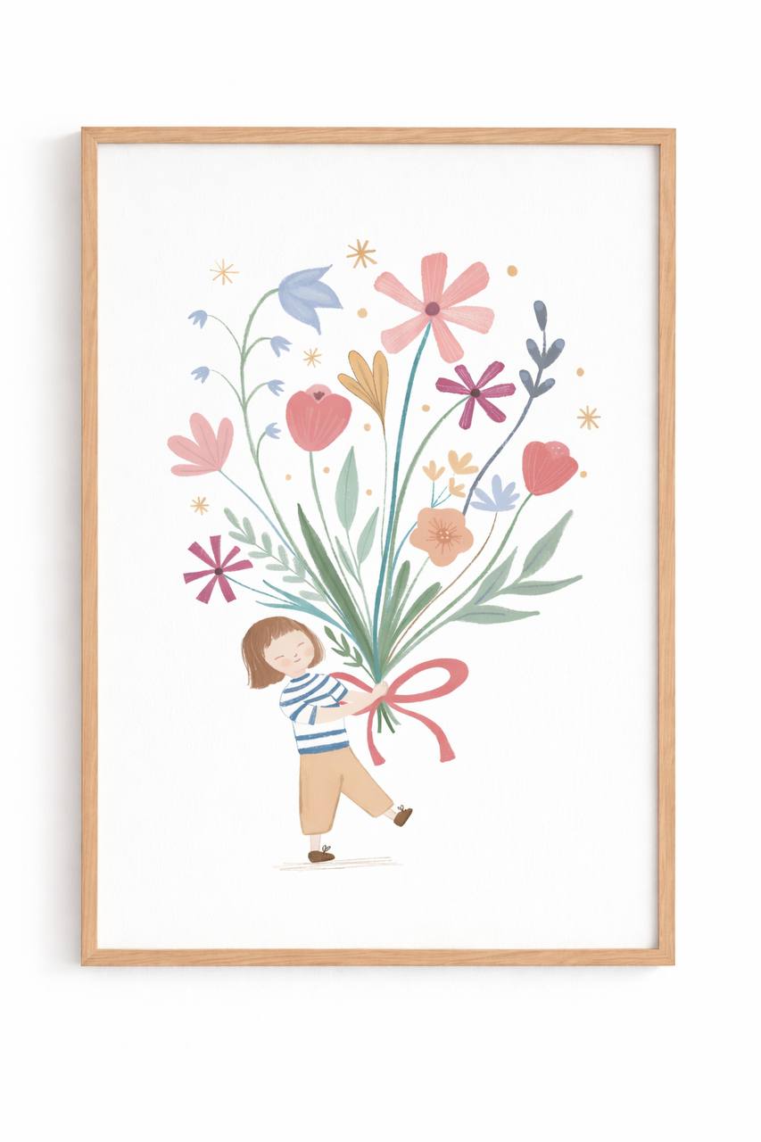 Ez a kis csíkos pólós kislány éppen egy hatalmas, színes virágcsokrot cipel — majdnem akkora, mint ő maga! 🌸💐 Tavaszi vidámság és gyermeki boldogság egyetlen képben. Kézzel rajzolt illusztráció, tökéletes választás kislányok szobájába vagy anyák napi ajándéknak.